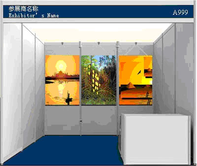 展位框架為鋁合金,裝三面墻板,藍色地毯,頂部安裝有二支照明燈;