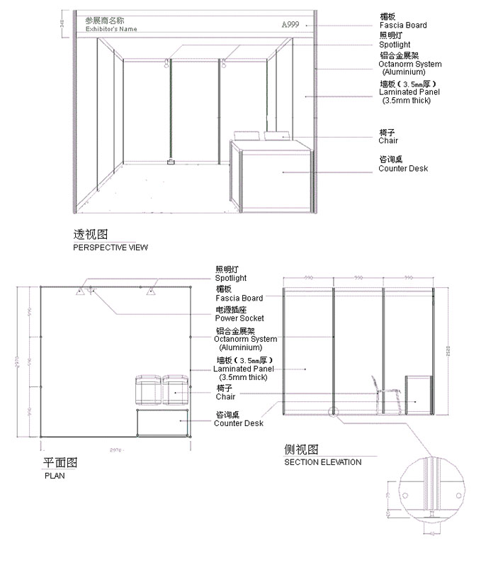 在標準展位正向上部提供寫有中英文參展商名稱和展位號的楣板,楣板高度一般為20cm;